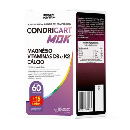 Modo de Uso Condricart MDK 60 comprimidos + 15 grátis Sidney Oliveira. Suplemento alimentar em comprimidos de Cálcio, Magnésio, Zinco, Vitaminas D3 e K2 para auxiliar na saúde dos ossos. - O Cálcio auxilia na formaçã