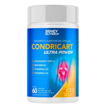 Condricart Ultra Power 60 cápsulas Sidney Oliveira Condricart Ultra Power é um suplemento de colágeno tipo II, vitamina D3, K2, C, B6 e os minerais Cobre, Zinco e Magnésio . - Colágeno tipo II não desnaturado auxi