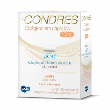 O que é e para que serve Condres colágeno Não Hidrolisado Tipo II? Condres são colágenos tipo II em cápsula, não hidrolisados, ou seja, colágenos praticamente puros, sem nenhuma alteração molecular. Essa substância bioativa auxilia na manutenção da função articular, e, de acordo com evidências científicas, seu consumo está relacionado à redução de dores e melhora no movimento. A fórmula de Condes contém, ainda, vitamina d e magnésio, que auxiliam na absorção do colágeno pelo corpo. Caixa contém: 90 cápsulas. Por que consumir colágeno? O colágeno é uma proteína naturalmente presente em nosso corpo, principalmente em tecidos como ossos, dentes, tendões e músculos, sendo que o colágeno tipo II é predominante na cartilagem. Porém, com o passar do tempo, por fatores como dieta e estilo de vida desequilibrados e questões de saúde, a fabricação natural dessa proteína pelo nosso organismo diminui. Por isso, especialistas indicam ingerir suplementos de colágeno para auxiliar na firmeza e hidratação da pele, por exemplo, e para atenuar os sintomas da artrose e de outros males que atacam as articulações. Benefícios de Condres Colágeno Não Hidrolisado Tipo II Ajuda a reduzir dores durante atividade física. Auxilia na manutenção da função articular. Com vitamina D e magnésio, que ajudam na absorção do colágeno. Sem açúcar. Sem glúten. Como usar Condres Colágeno Não Hidrolisado Tipo II? Ingerir uma cápsula de Condres ao dia, ou conforme determinação médica. Importante Procure sempre um médico ou especialista antes de fazer uso de qualquer substância. Ingredientes Colágeno tipo II não desnaturado. Corante: dióxido de titânio. Estabilizante: celulose microcristalina. Gelificante: gelatina. Veículo: água. NÃO CONTÉM GLÚTEN. Advertências Gestantes, nutrizes e crianças somente devem consumir este produto sob orientação de nutricionista ou médico. Não existem evidências científicas comprovadas que este alimento previna, trate ou cure doenças. Uso adulto. Manter fora do alcance das crianças.
